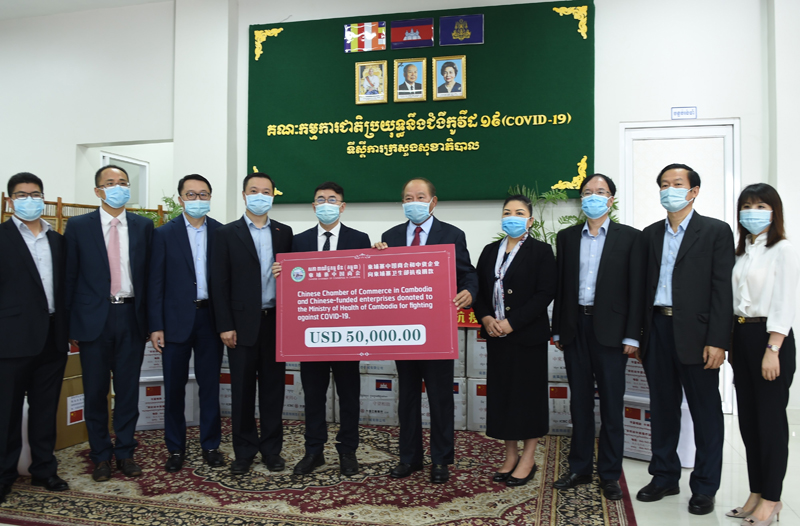 5月8日,中國電建柬埔寨代表處國別代表趙金輝以柬埔寨中國商會秘書長身份與中國商會會長敬駿、常務副會長王化斌等率在柬中資企業向柬政府捐贈一批防疫物資,并以“抗疫基金”名義向柬衛生部捐贈5萬美元,用于支持政府防控委員會防疫。柬埔寨衛生部大臣曼本亨感謝中國商會及中資企業為柬防控疫情作出的努力。