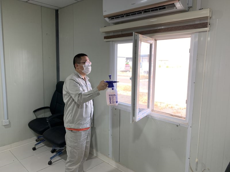 在防疫物資緊缺的情況下,項目部通過與使館和中國商會協(xié)調(diào)、采取國內(nèi)運送、當(dāng)?shù)夭少彽雀鞣N渠道購買了滿足項目部三個月使用量的防護(hù)口罩和酒精、消毒液等各類防疫物資,迅速組建起防疫物資與生活物資儲備庫,保障項目部現(xiàn)場員工的生命健康安全。