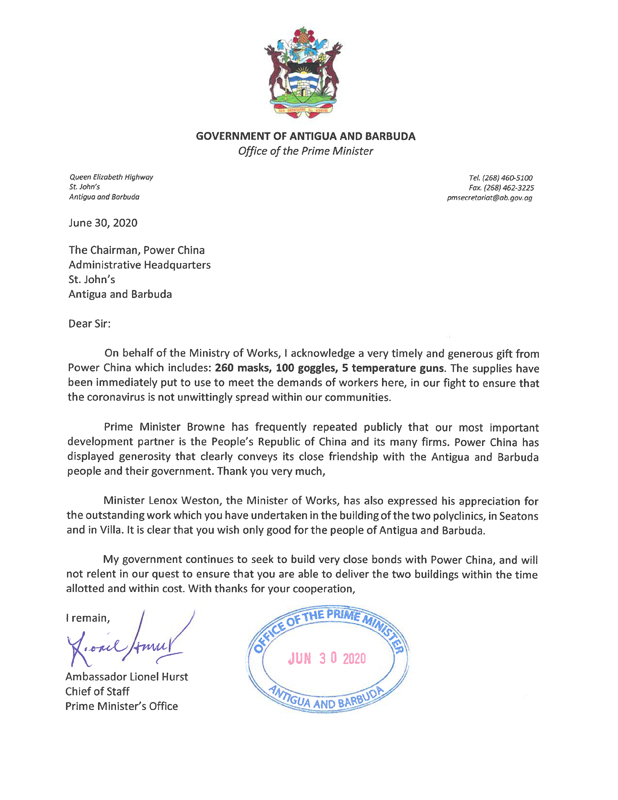 在總理府辦公室的來信中,安巴總理賈斯頓·布朗表示,在這場席卷全球的新冠疫情危機面前,感謝中國電建愿與安巴政府同心協力、共同抗疫。在安巴出現醫療物資困難之際,伸出援助之手,彰顯了中國與安巴人民之間的親密友誼,同時也體現了中國電建的企業責任與擔當。
