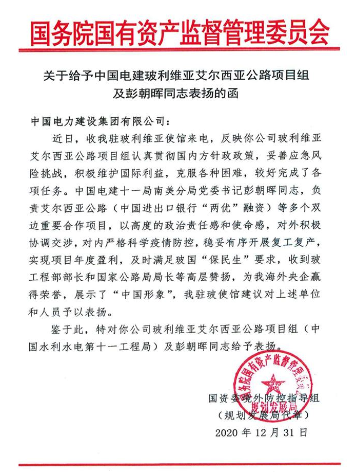 信函中表示,國資委境外防控指導組收到中國駐玻利維亞使館來電,反映中國電建玻利維亞艾爾西亞公路項目組認真貫徹國內方針政策,妥善應對風險挑戰,積極維護國家利益,克服各種困難,較好完成了各項任務。彭朝暉同志以高度的政治責任感和使命感,對外積極協調交涉,對內嚴格科學疫情防控,穩妥有序開展復工復產,實現項目年度盈利,及時滿足玻國“保民生”要求,收到玻工程部部長和國家公路局局長等高層贊揚。項目組和彭朝暉為海外央企贏得榮譽,展示了“中國形象”,得到了中國駐玻使館的肯定,特予表揚。