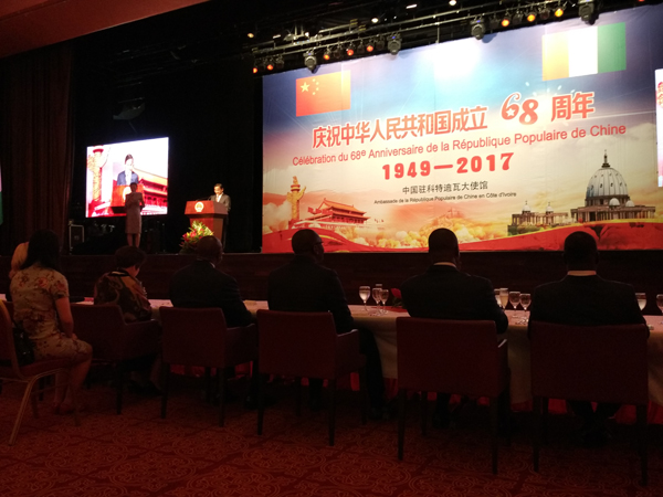 當地時間9月25日,中國駐科特迪瓦大使館在首都阿比讓象牙酒店會議宮隆重舉行中華人民共和國成立68周年國慶招待會。科特迪瓦第一夫人多米尼克·瓦塔拉閣下、副總統丹尼爾·卡布蘭·敦坎閣下、總理阿瑪杜·戈恩·庫利巴利閣下、國防部長哈米德·巴卡約科閣下、副議長阿卡·阿烏雷閣下等政府官員、各國駐科使節、國際機構駐科代表及各駐科中資企業代表等應邀出席。